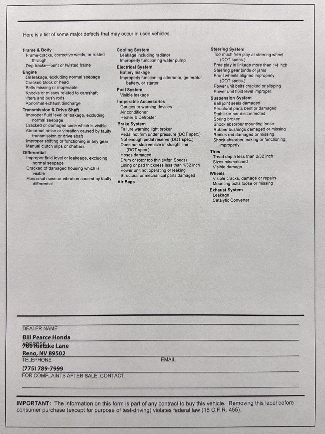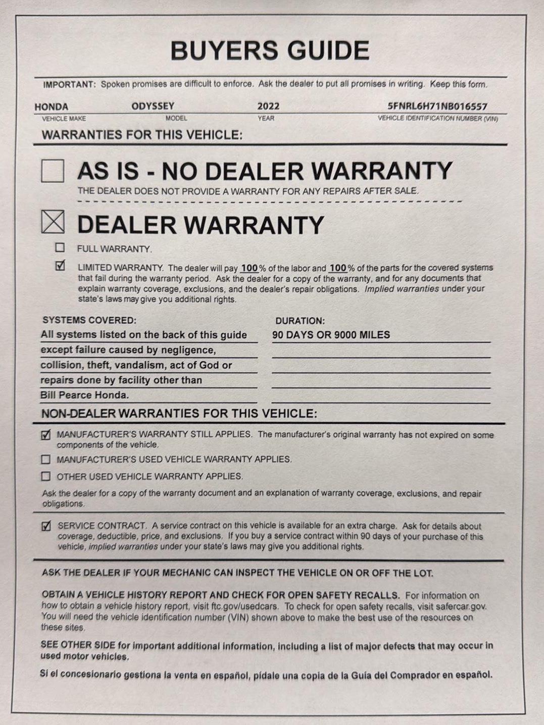 - Roadside warranty 36 month/36,000 miles