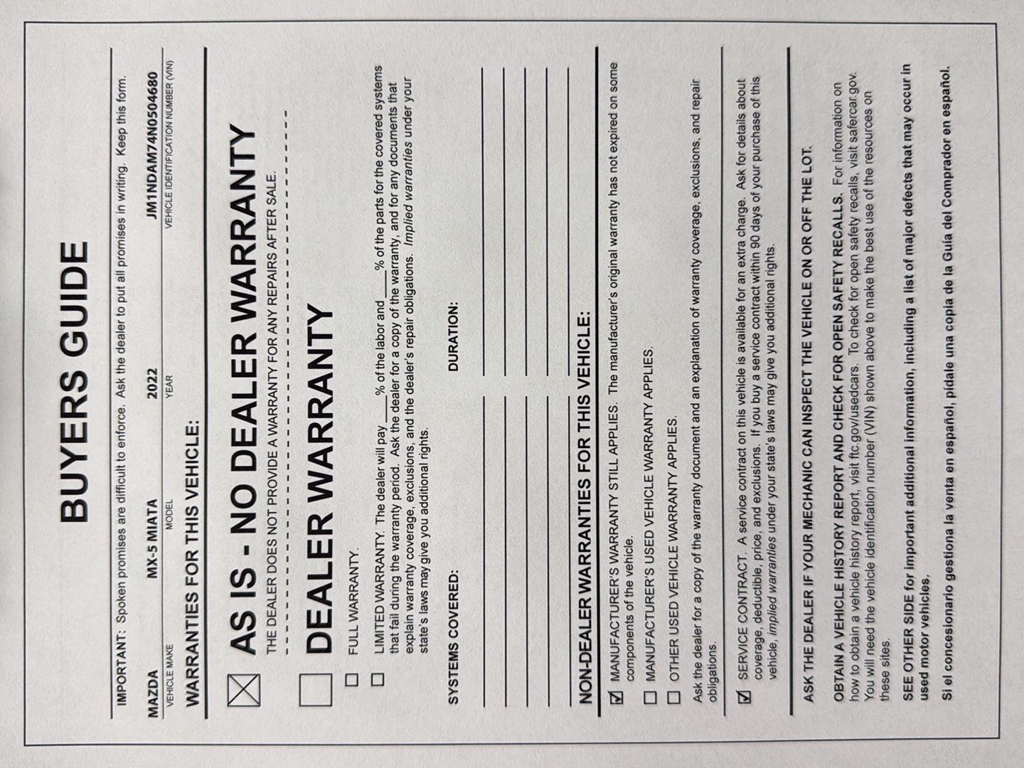 - Roadside warranty 36 month/unlimited