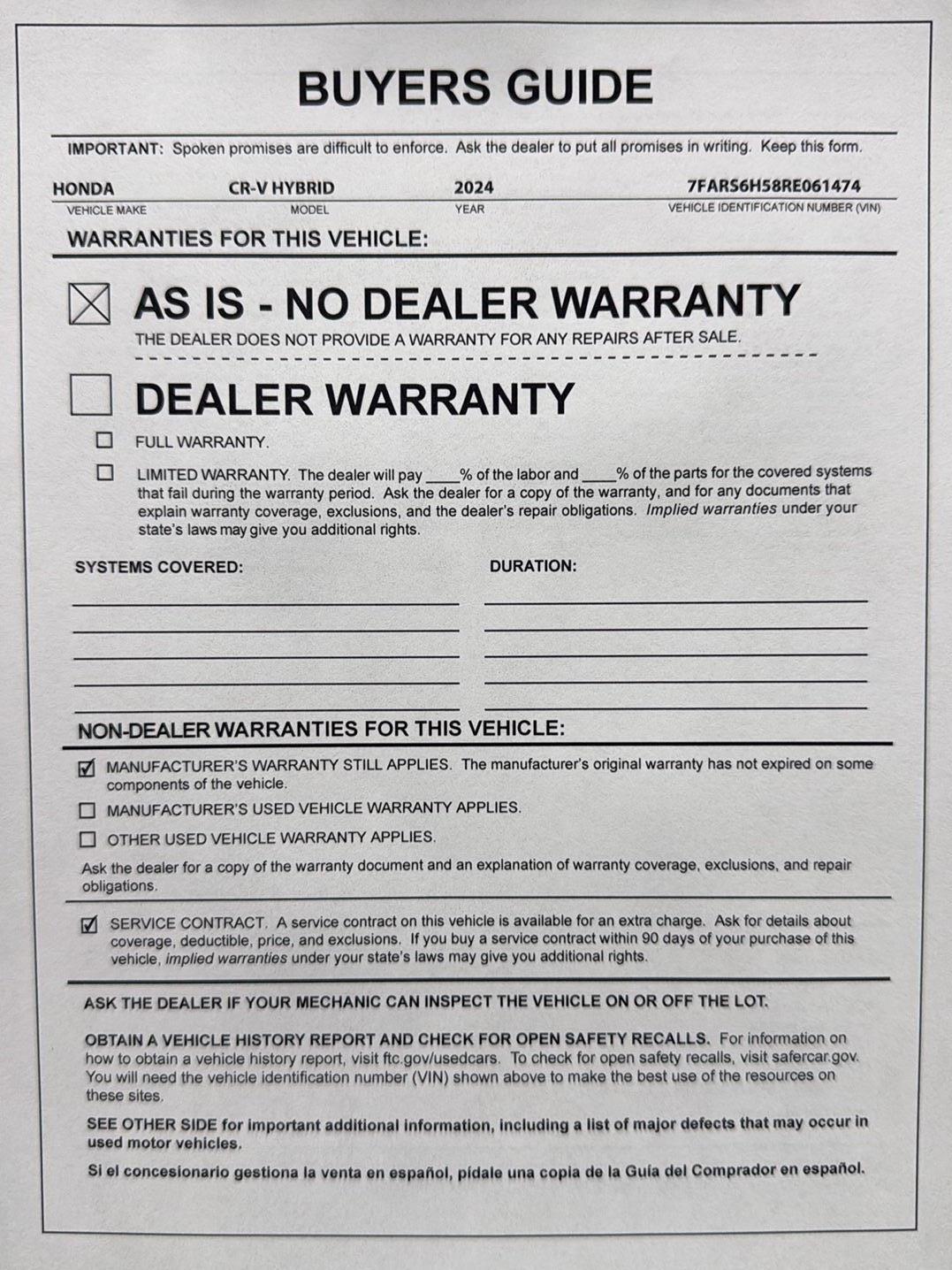 - Roadside warranty 36 month/36,000 miles